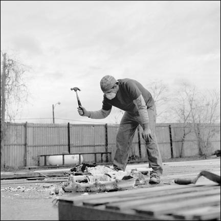 | Hammering off the Ceramic Shell bleached & toned gelatin silver photograph 2009 |