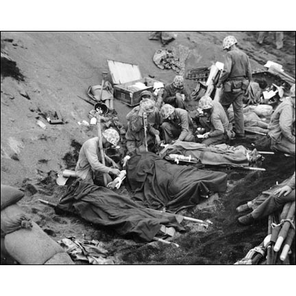| Obie Newcomb, Jr., USMC Blood Plasma and Whole Blood - Navy Doctors and Corpsmen Treat Marines on Iwo Jima 1945 Vintage Silver Gelatin Photograph Gift of Barbara Joynt King in honor of Kenneth Richards Joynt LTJG USN, for his services at Omaha Beach with the 7th Naval Beach Battalion (LCI#84) June 6-July 4, 1944 and on USS Sevier (APA-233) at Iwo Jima, March 14-20, 1945, The Museum of Fine Arts, Houston |